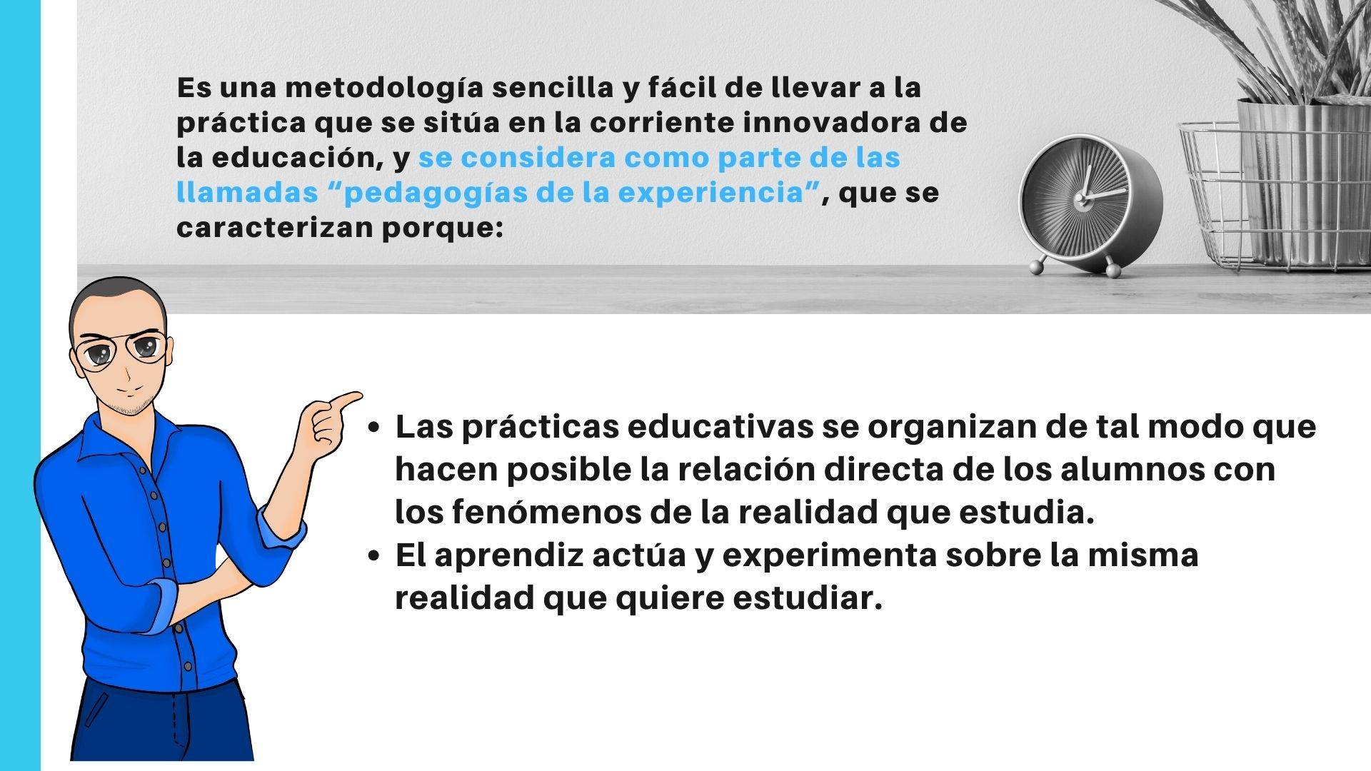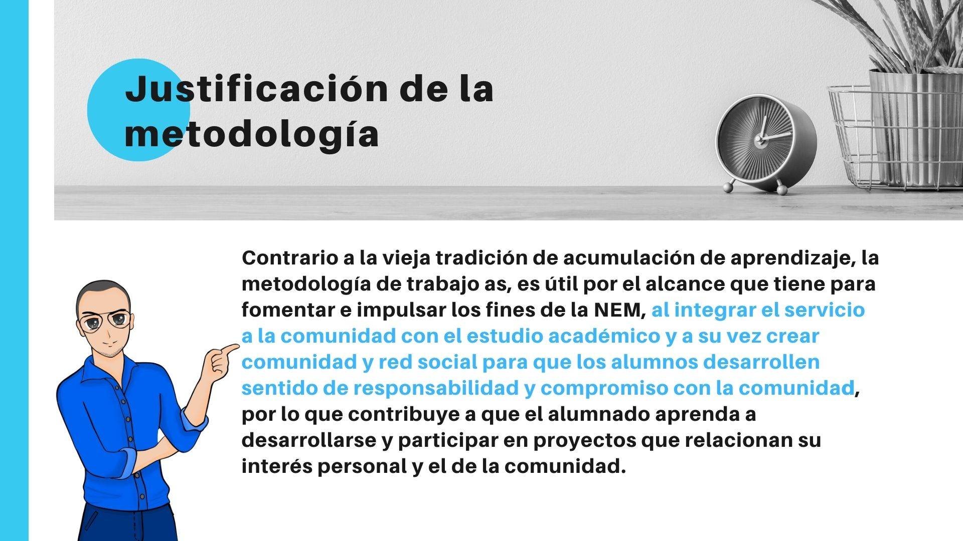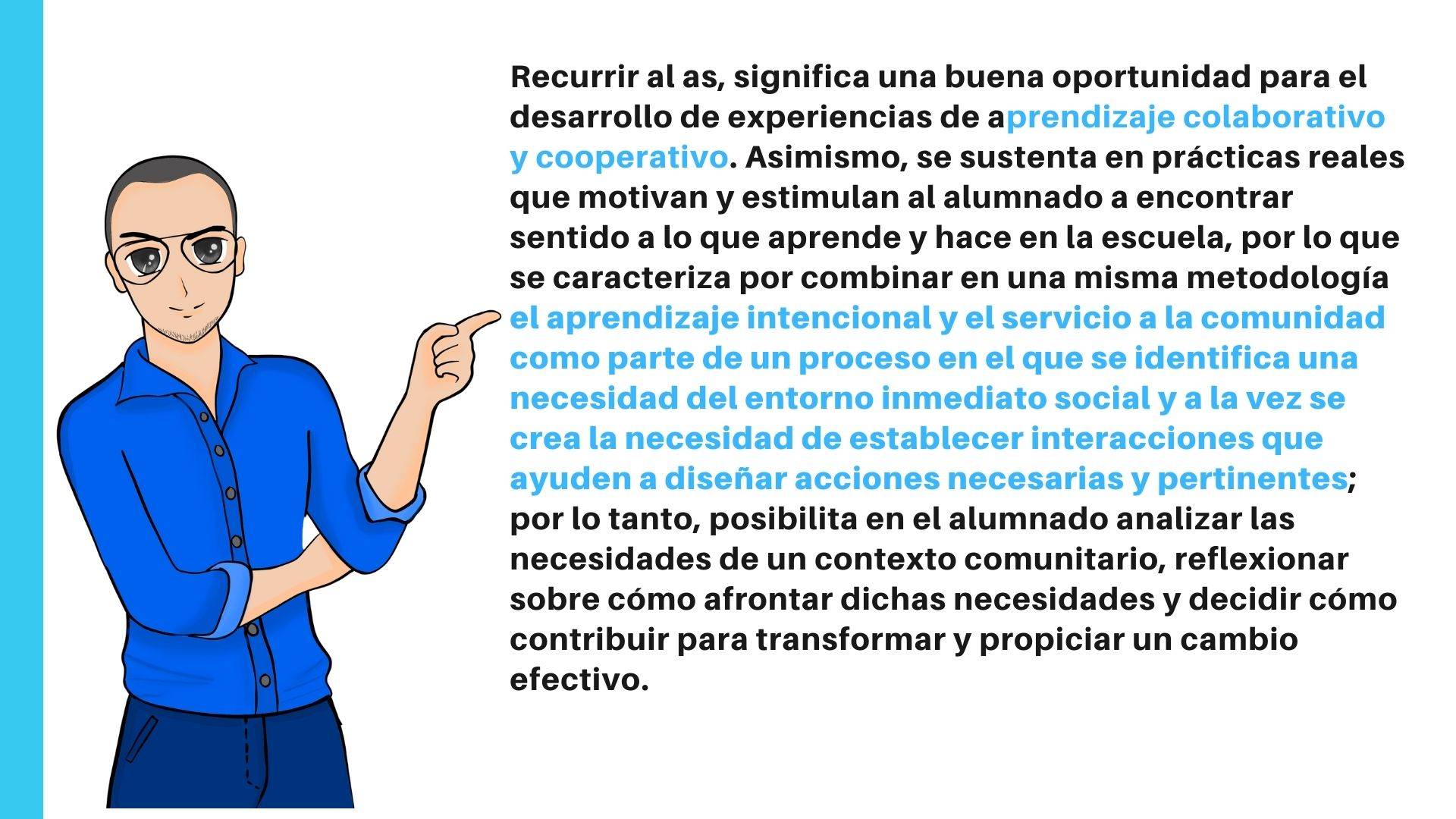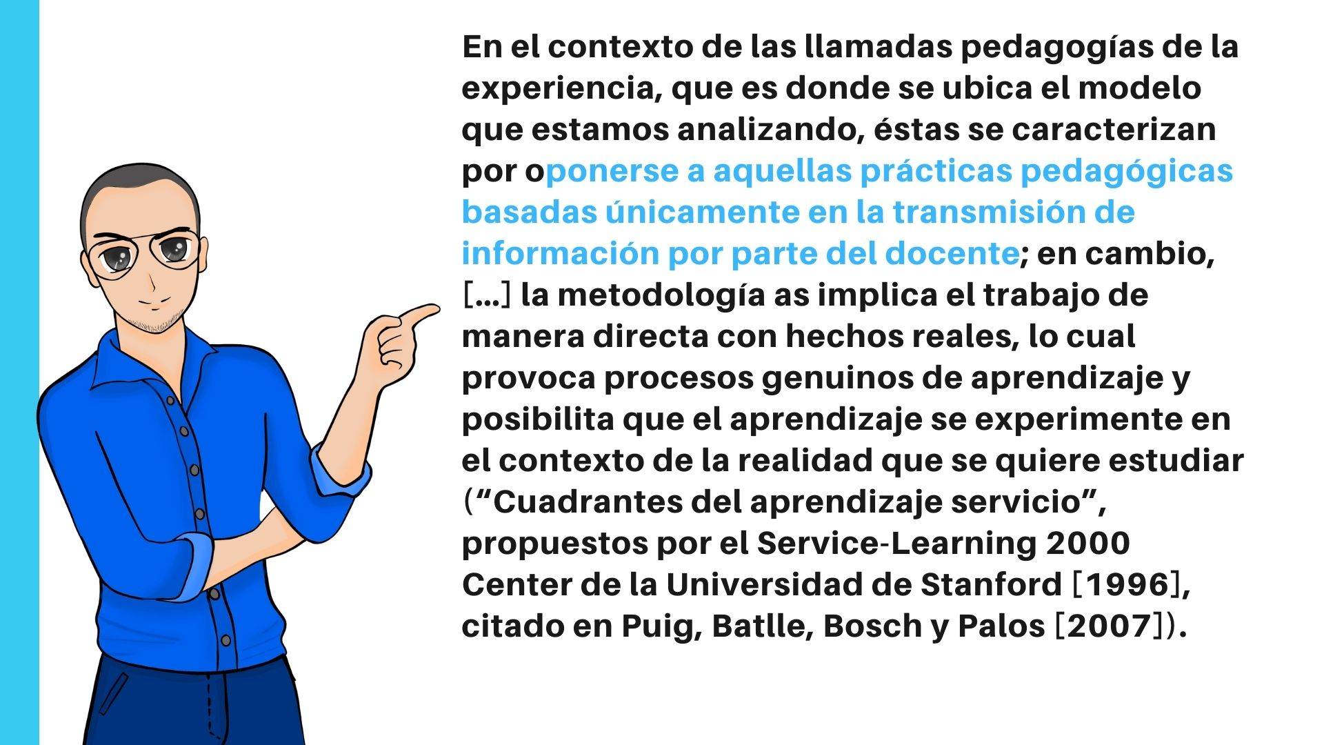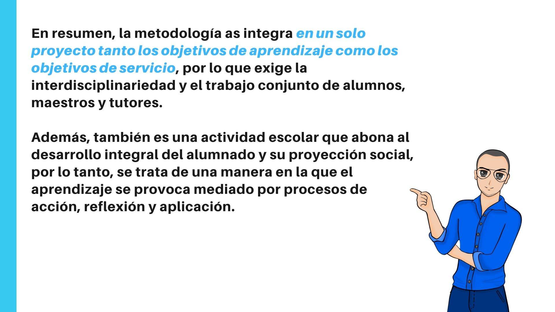 El aprendizaje-servicio es una metodología innovadora en la que, a través de la modificación de la realidad, se intenta mejorar el aprendizaje del alumnado. En él se toma como base la educación basada en competencias, el aprendizaje por proyectos o problemas, el aprendizaje cooperativo y colaborativo, el fomento del emprendimiento, las inteligencias múltiples, la convivencia positiva, la gamificación, etc. Además, prima el fomento de la autonomía del alumnado.
