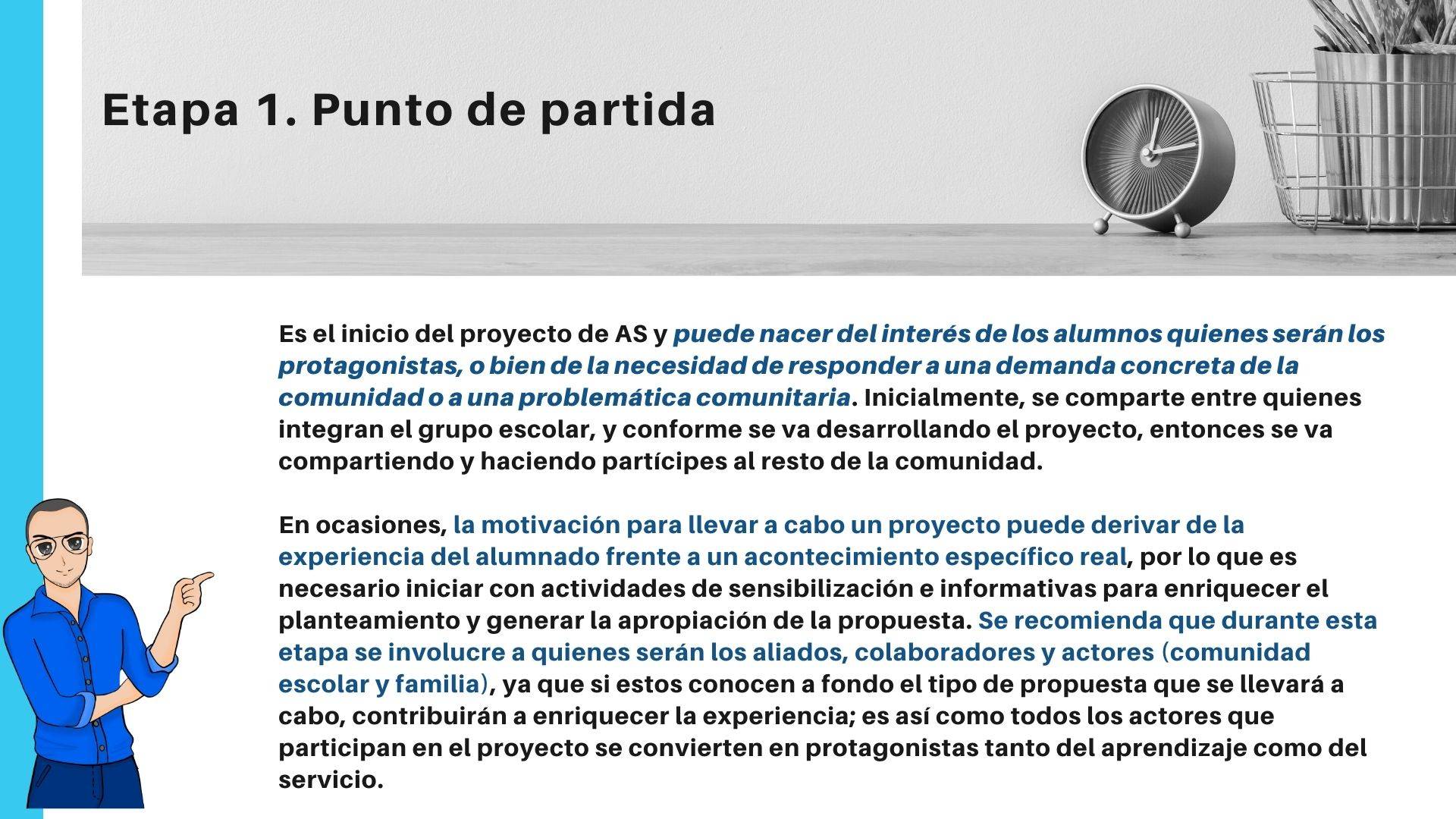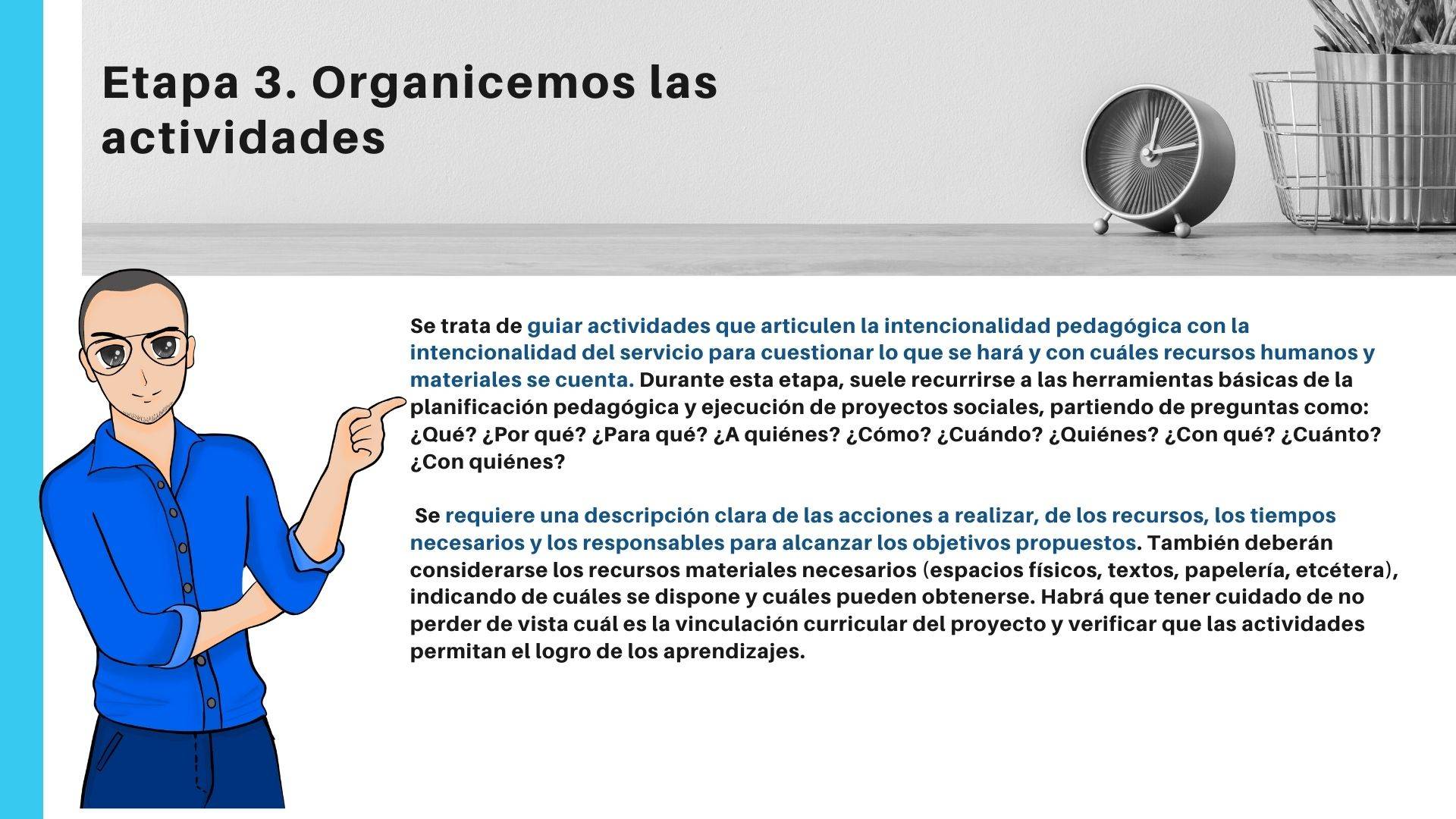 • Aprendizajes intencionadamente planificados en relación con la actividad solidaria: el proyecto articula, explícitamente, el aprendizaje de contenidos curriculares, en el caso de las instituciones educativas, o formativas, en el caso de las organizaciones sociales.