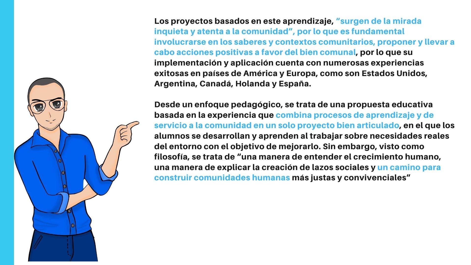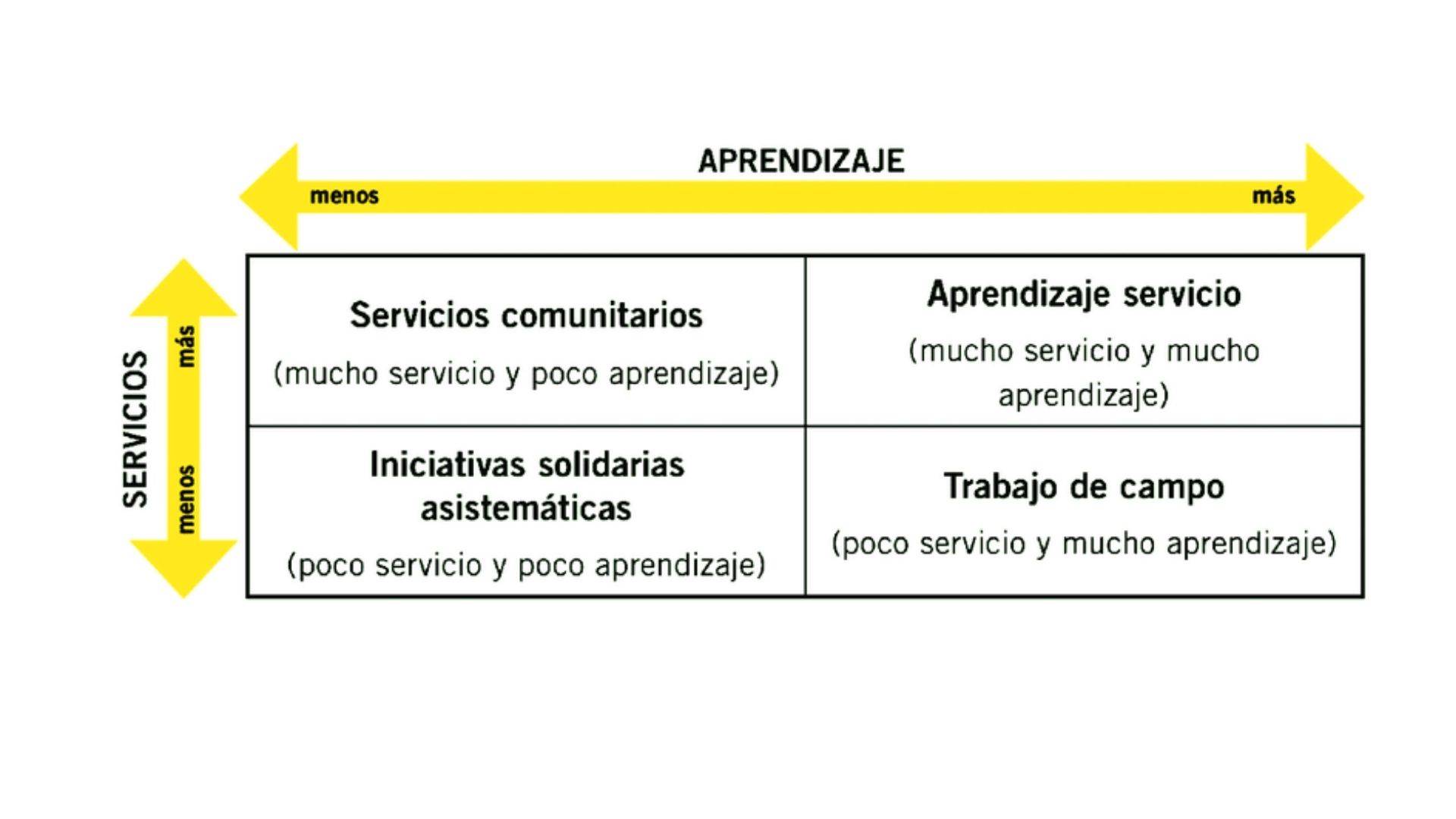 Aparte de la adquisición de conocimientos, en el aprendizaje-servicio el alumnado se identifica en su entorno próximo con una situación con cuya mejora se compromete, desarrollando un proyecto solidario que pone en juego conocimientos, habilidades, actitudes y valores. Al aprendizaje formativo se le une otro elemento fundamental: el compromiso social.