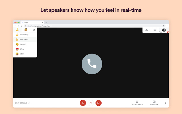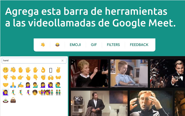Use emoji, GIF y filtros de video durante las llamadas de Google Meet o Hangouts. Esta extensión gratuita de Chrome le permite reaccionar a lo que dicen los participantes sin interrumpir el flujo de la conversación.