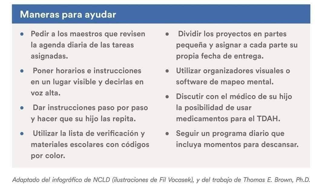 Los especialistas en trastornos del aprendizaje han desarrollado formas de reforzar las habilidades organizacionales que no nacen de manera natural en un niño con un mal funcionamiento ejecutivo. Enseñan una combinación de estrategias específicas y estilos alternativos de aprendizaje que complementan o mejoran las habilidades particulares de un niño. Estas son algunas de las herramientas que les enseñan a los niños (y a los padres) para ayudarlos a abordar el trabajo escolar, así como otras responsabilidades que requieren organización y seguimiento.