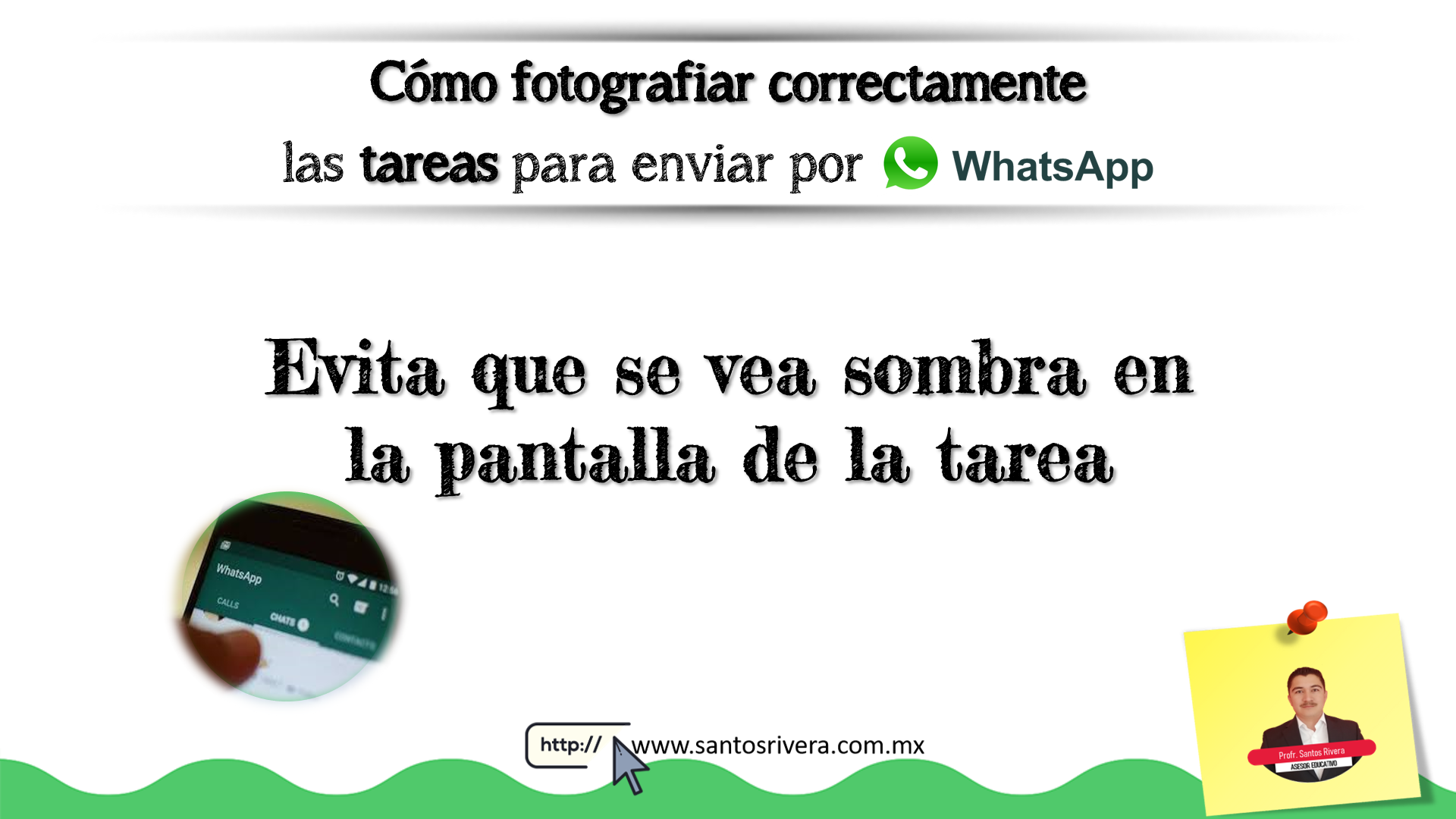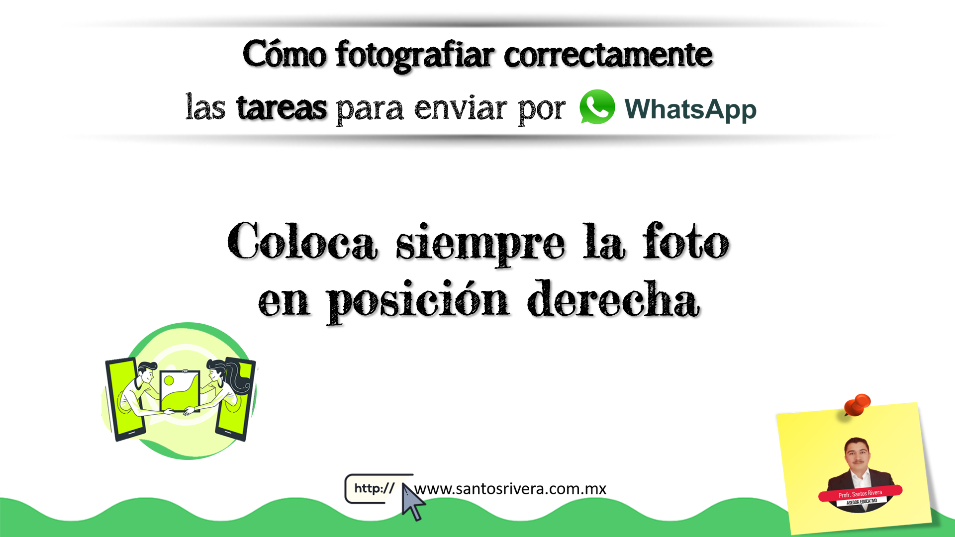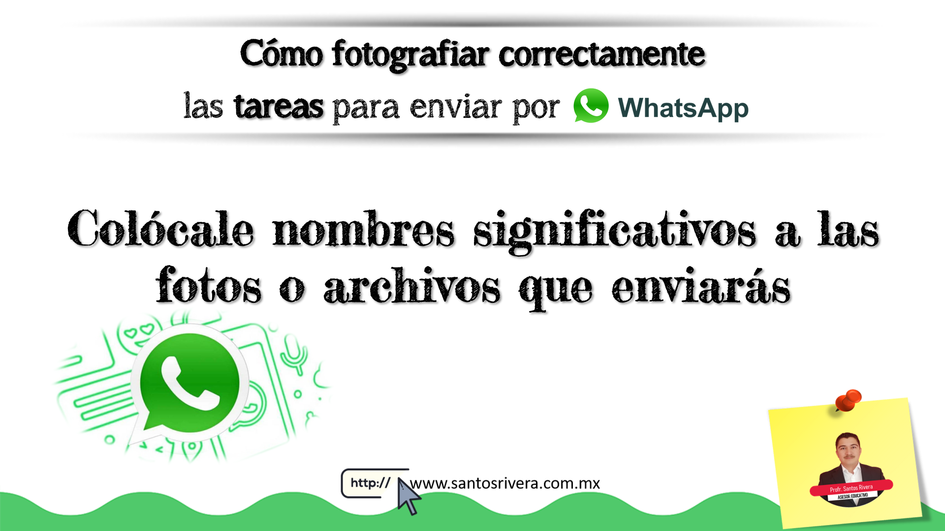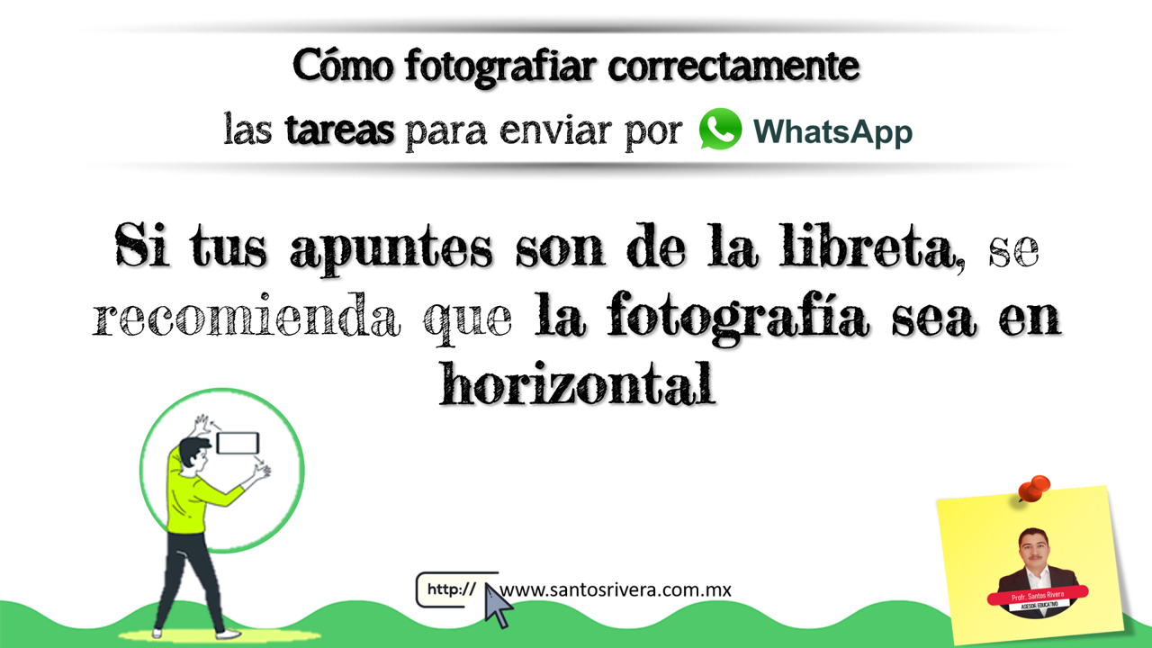 En esta infografía realizada por el profesor Santos Rivera da algunos tips para los docentes y estudiantes, ya que ahorrarán trabajo a la hora de enviar y recibir fotos de las tareas, ya sea como contenido educativo o a la hora de entregar actividades o evaluaciones vía WhatsApp.