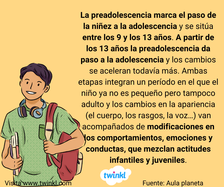 La preadolescencia marca el paso de la niñez a la adolescencia y se sitúa entre los 9 y los 13 años. A partir de los 13 años la preadolescencia da paso a la adolescencia y los cambios se aceleran todavía más. Ambas etapas integran un período en el que el niño ya no es pequeño pero tampoco adulto y los cambios en la apariencia (el cuerpo, los rasgos, la voz…) van acompañados de modificaciones en los comportamientos, emociones y conductas, que mezclan actitudes infantiles y juveniles. Generalmente, el fin de la adolescencia y la llegada de la juventud se establecen entre los 18 y los 20 años.
