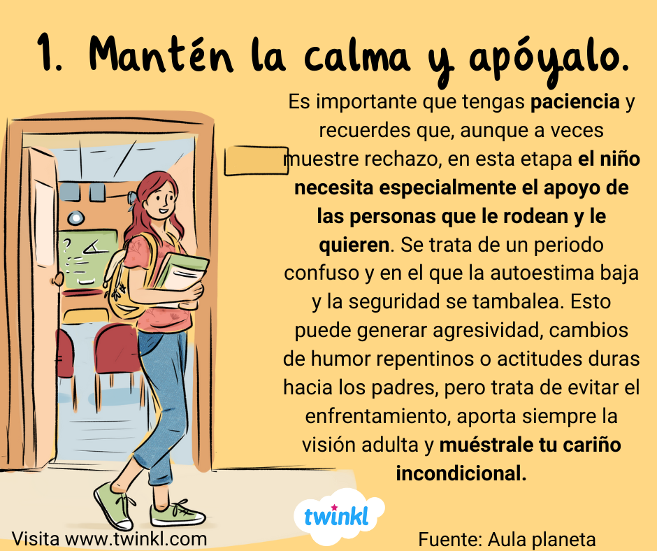 - 1. Mantén la calma y apóyale. Es importante que tengas paciencia y recuerdes que, aunque a veces muestre rechazo, en esta etapa el niño necesita especialmente el apoyo de las personas que le rodean y le quieren. Se trata de un periodo confuso y en el que la autoestima baja y la seguridad se tambalea. Esto puede generar agresividad, cambios de humor repentinos o actitudes duras hacia los padres, pero trata de evitar el enfrentamiento, aporta siempre la visión adulta y muéstrale tu cariño incondicional.