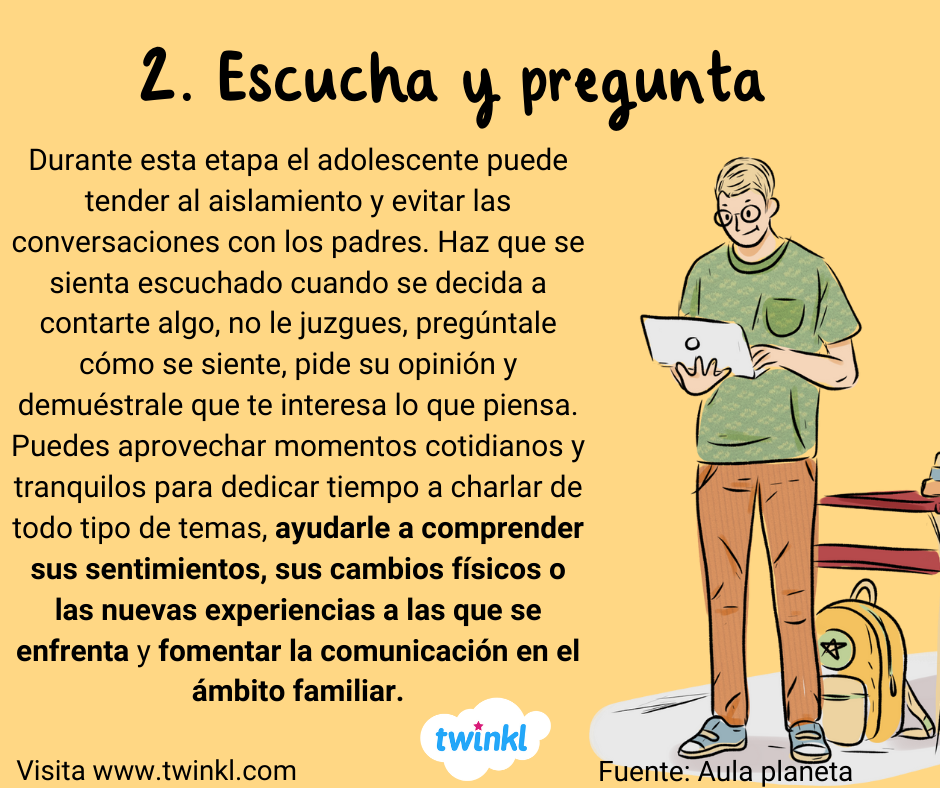 - 2. Escucha y pregunta. Durante esta etapa el adolescente puede tender al aislamiento y evitar las conversaciones con los padres. Haz que se sienta escuchado cuando se decida a contarte algo, no le juzgues, pregúntale cómo se siente, pide su opinión y demuéstrale que te interesa lo que piensa. Puedes aprovechar momentos cotidianos y tranquilos para dedicar tiempo a charlar de todo tipo de temas, ayudarle a comprender sus sentimientos, sus cambios físicos o las nuevas experiencias a las que se enfrenta y fomentar la comunicación en el ámbito familiar.