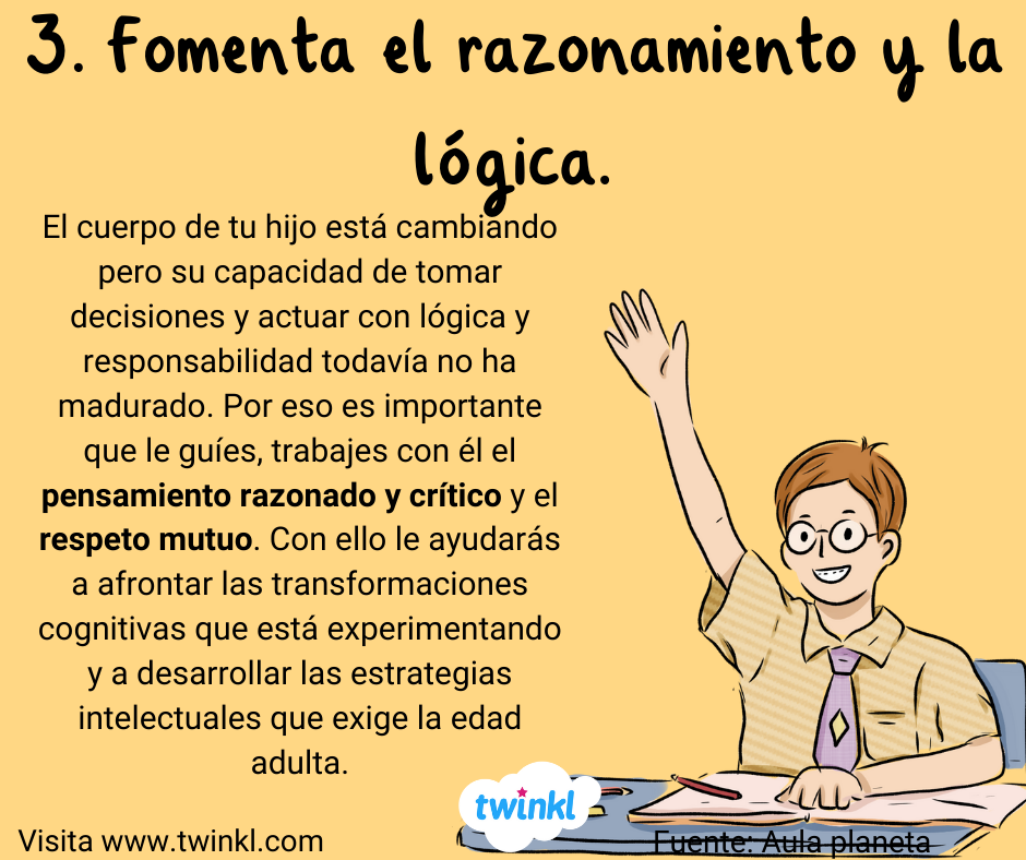 - 3. Fomenta el razonamiento y la lógica. El cuerpo de tu hijo está cambiando pero su capacidad de tomar decisiones y actuar con lógica y responsabilidad todavía no ha madurado. Por eso es importante que le guíes, trabajes con él el pensamiento razonado y crítico y el respeto mutuo. Con ello le ayudarás a afrontar las transformaciones cognitivas que está experimentando y a desarrollar las estrategias intelectuales que exige la edad adulta.