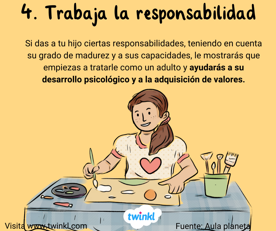 - 4. Trabaja la responsabilidad. Si das a tu hijo ciertas responsabilidades, teniendo en cuenta su grado de madurez y a sus capacidades, le mostrarás que empiezas a tratarle como un adulto y ayudarás a su desarrollo psicológico y a la adquisición de valores.