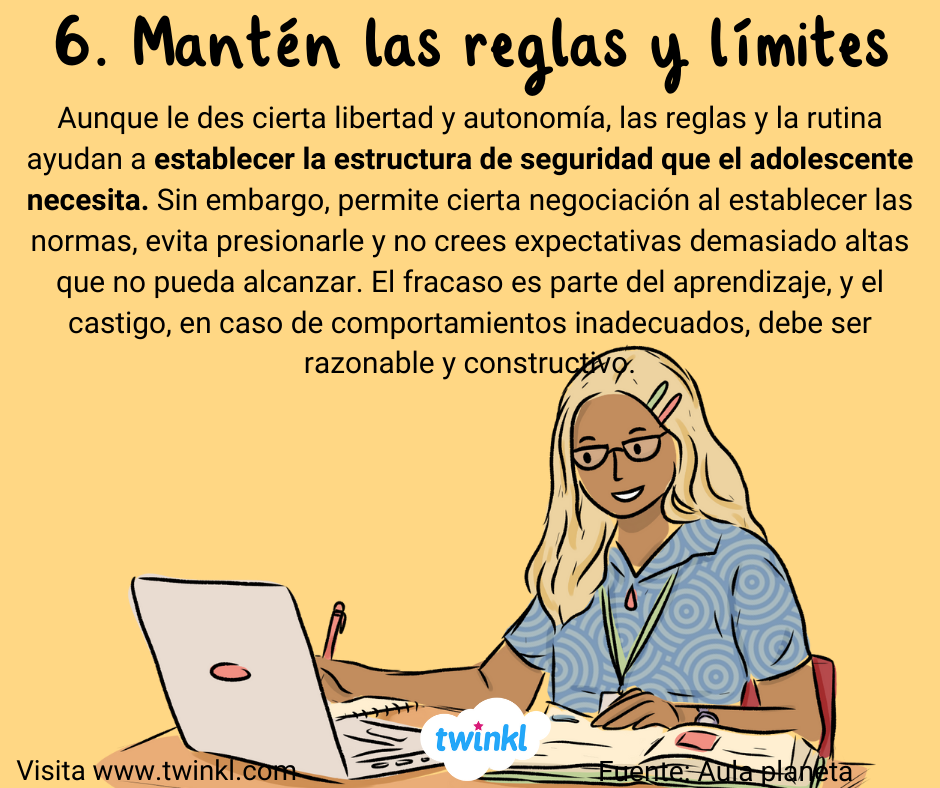 - 6. Mantén unas normas. Aunque le des cierta libertad y autonomía, las reglas y la rutina ayudan a establecer la estructura de seguridad que el adolescente necesita. Sin embargo, permite cierta negociación al establecer las normas, evita presionarle y no crees expectativas demasiado altas que no pueda alcanzar. El fracaso es parte del aprendizaje, y el castigo, en caso de comportamientos inadecuados, debe ser razonable y constructivo.