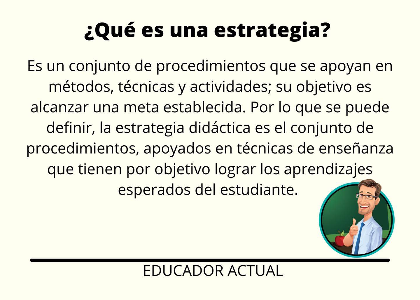 Una estrategia es, en un sentido estricto, un procedimiento organizado, formalizado y orientado a la obtención de una meta claramente establecida. Su aplicación en la práctica diaria requiere del perfeccionamiento de procedimientos y de técnicas cuya elección detallada y diseño son responsabilidad del docente.