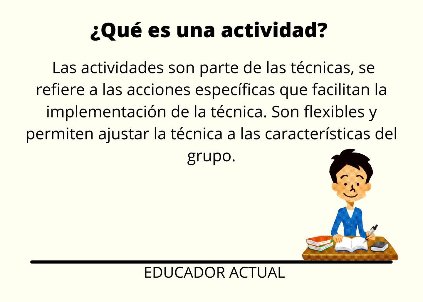 Las actividades son parte de las técnicas y son acciones específicas que facilitan la ejecución de la técnica. Son flexibles y permiten ajustar la técnica a las características del grupo.