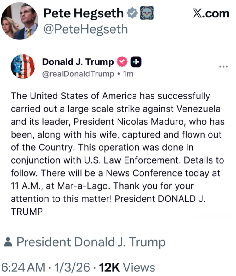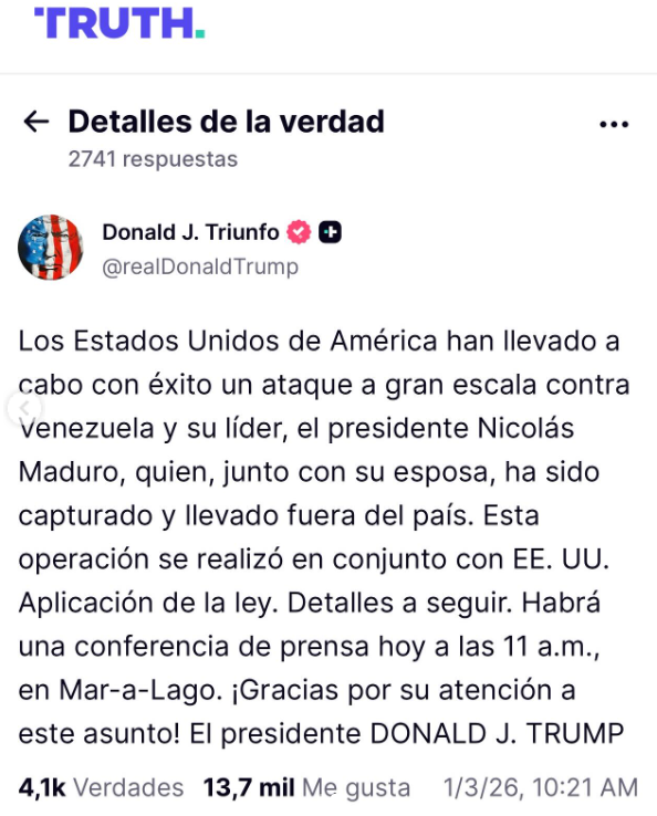 El presidente de Estados Unidos, Donald Trump, anunció mediante una publicación en su plataforma Truth Social que su país habría ejecutado una “operación militar de gran escala” en Venezuela. Según su declaración, la acción concluyó con la captura del presidente venezolano Nicolás Maduro, quien habría sido trasladado por vía aérea fuera del territorio venezolano junto a su esposa, Cilia Flores.