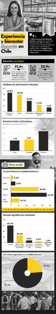 Infografía: Michel Leiva M. | Contenido: Vladimir Núñez | Laboratorio de Investigación e Innovación Docente de la Universidad San Sebastián (LIID-USS); Instituto de Bienestar Socioemocional (IBEM); Centro de Innovación en Liderazgo Educativo (CILED-UDD); Elige Educar; Fundación Santillana.