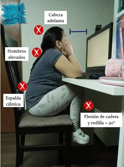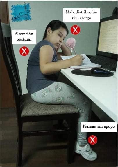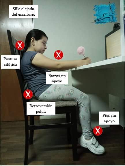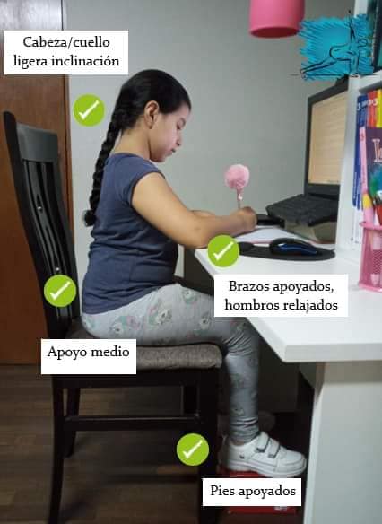 El escritorio usado para hacer sus tareas debe tener la altura adecuada. Para mantener la espalda erguida apoya en el respaldar del asiento, los pies del niño deben llegar al piso, mientras la mesa debe aproximarse a los codos cuando sean flexionados.