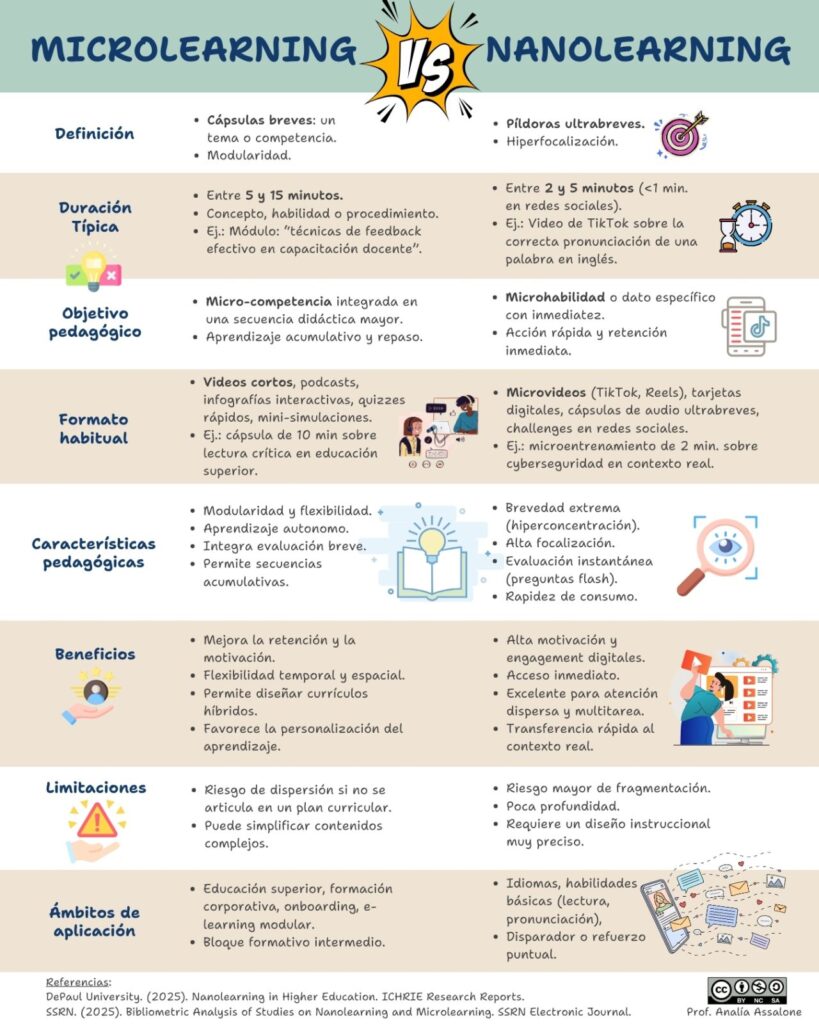 El microlearning ofrece modularidad, flexibilidad y autonomía, además de permitir evaluaciones breves y secuencias acumulativas. En contraste, el nanolearning se distingue por la brevedad extrema, la focalización en un único objetivo y la evaluación instantánea, lo que favorece la transferencia rápida al contexto real.