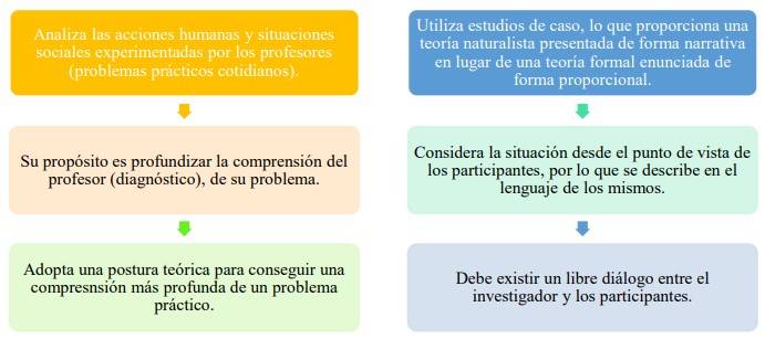 La define a partir del estudio de situaciones sociales con el propósito de mejorar la calidad de la acción dentro de éstas, la interpreta como la reflexión de acciones humanas y situaciones sociales vividas por los profesores, tienen como objetivo ampliar la comprensión o diagnóstico de los problemas prácticos de los docentes. |
