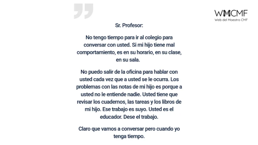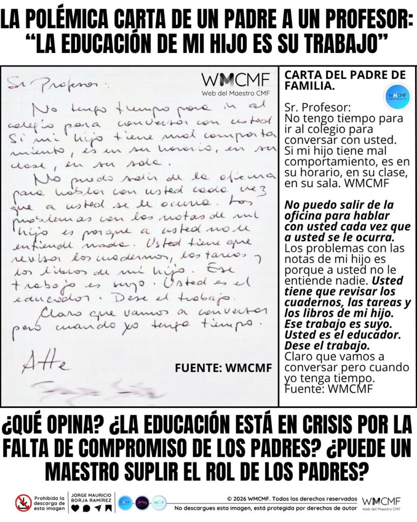 El mensaje expuesto evidencia una percepción distorsionada del rol docente, reduciéndolo a un ejecutor de tareas académicas, cuando en realidad su función es mucho más compleja. El docente no solo enseña contenidos, sino que guía procesos, forma hábitos, desarrolla habilidades socioemocionales y acompaña trayectorias humanas. Pretender que, además, asuma el rol completo de los padres implica una sobrecarga que desborda cualquier marco profesional razonable.