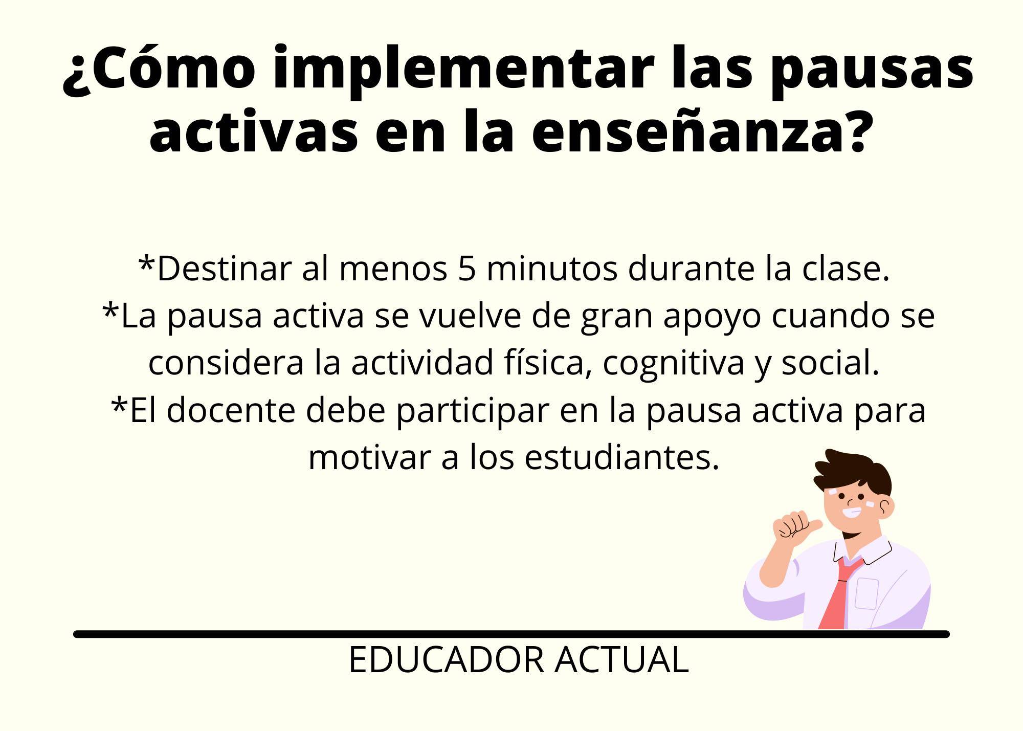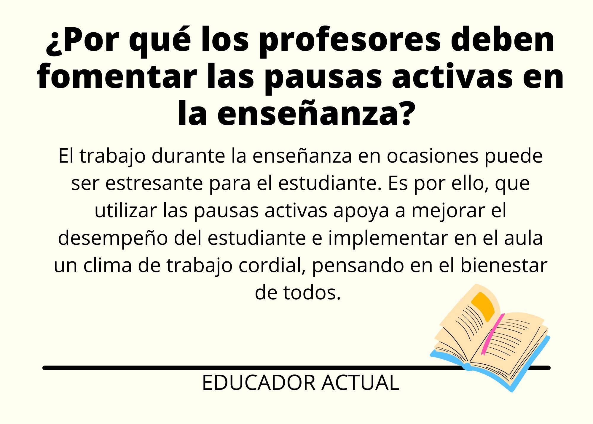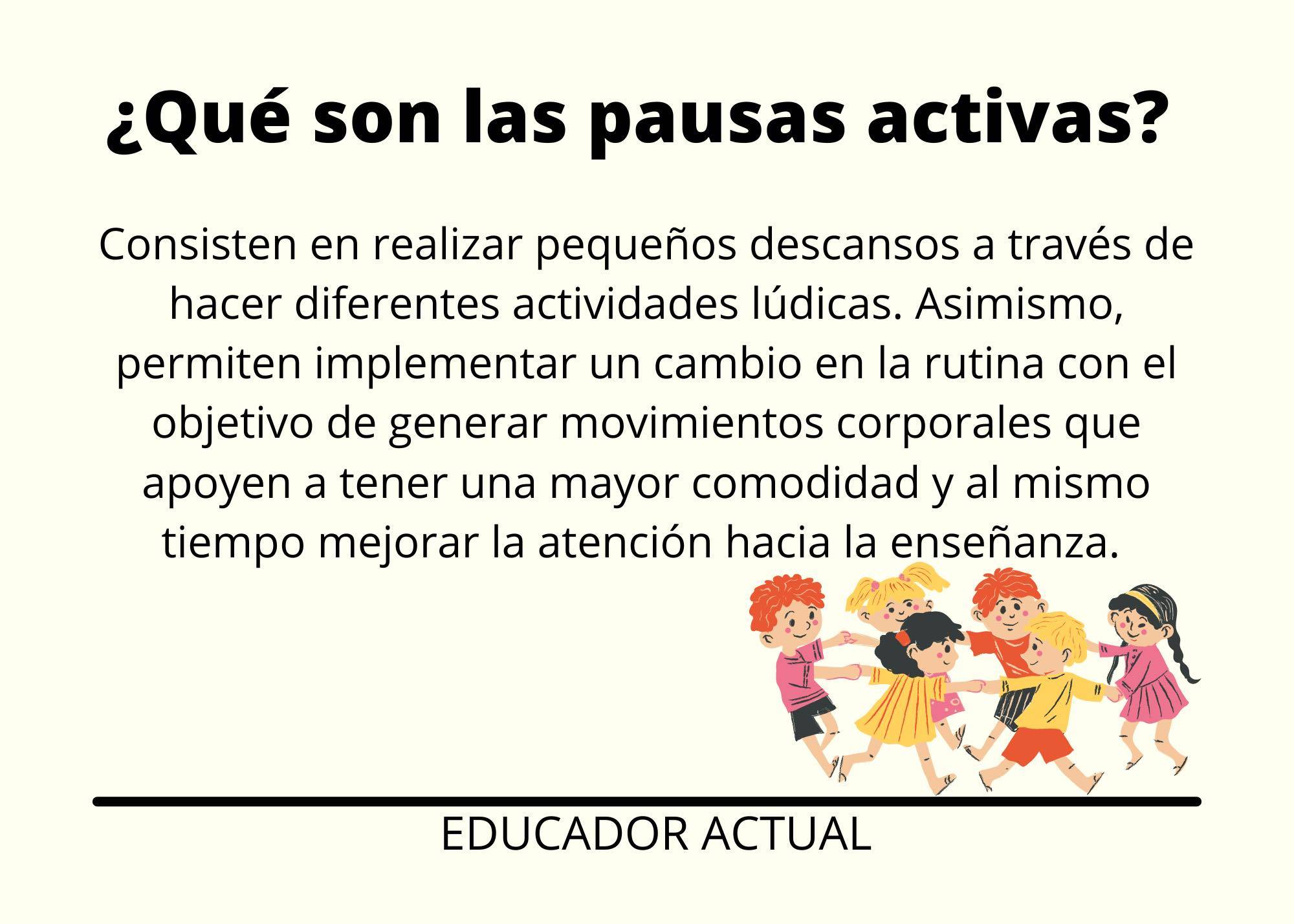 Las pausas o descansos activos son periodos cortos durante la jornada escolar en los que se detiene la actividad escolar más intelectual y sedentaria (explicaciones, preguntas, debates o ejercicios) para realizar una actividad física como bailar, saltar o estiramientos. Es muy común que se realicen entre clase y clase, más o menos cada 50 minutos.