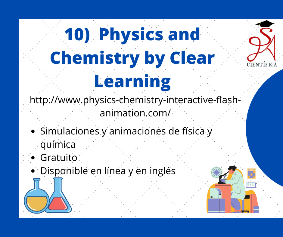 - CHEMISTRY EXPERIMENT SIMULATIONS: Este laboratorio virtual de Química de la Universidad de Iowa (en ingles) permite realizar reacciones, manejar una celda electroquímica, volumetrías redox, prácticas sobre las leyes de los gases, disoluciones, Termoquímica, volumetrías ácido base, ecuaciones de equilibrio, medir el pH, Cinética, estequiometría, etc.