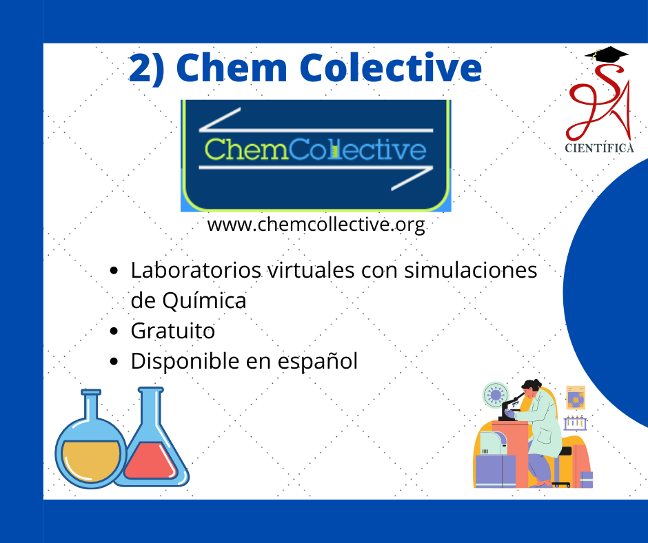 - CHEM COLLECTIVE: Iniciativa del Dr. David Yaron, profesor asociado de Química en la Universidad Carnegie Mellon, es una aplicación de gran calidad, accesible en una gran cantidad de idiomas, entre ellos el español. Se pueden realizar muchas actividades de un laboratorio químico, como termoquímica, preparación de disoluciones, química analítica, reacciones redox, ácido base, solubilidad, etc.